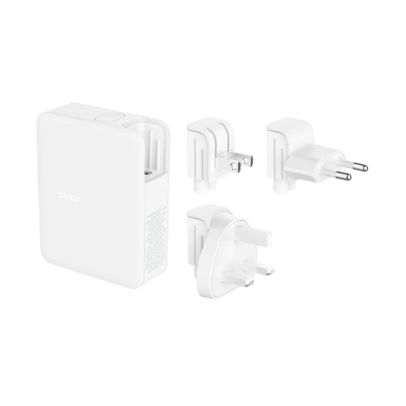 تتضمن رؤوس قابلة للتبديل لأنواع القوابس US وUK وEU. يتميز التصميم المدمج بمقابس قابلة للطي (في US فقط) لتسهيل السفر.