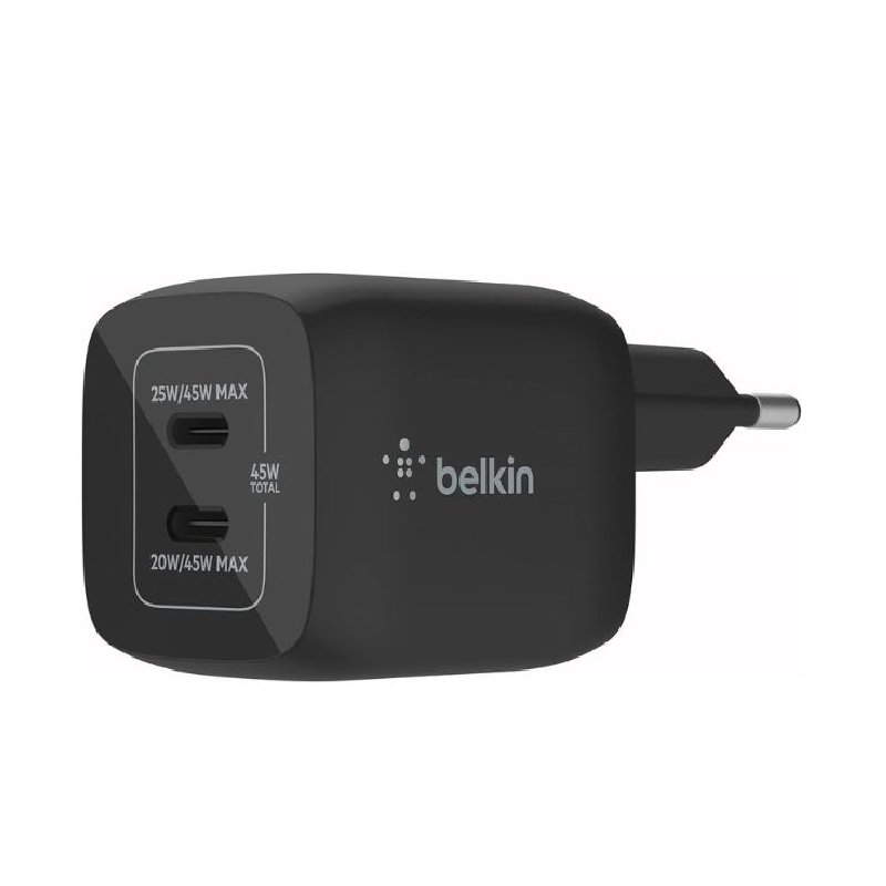 Dual USB-C Ports: Charge two USB-C devices at once. 45 W Total Output: Provides up to 45 W when one device is connected. GaN Technology: Gallium Nitride enables a compact, efficient, cooler charging brick compared with traditional silicon chargers.